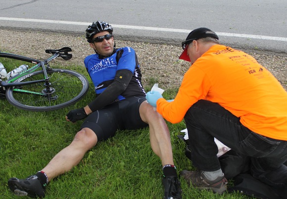 - Les premiers soins pour un cycliste qui a chuté, à l’arrivée.