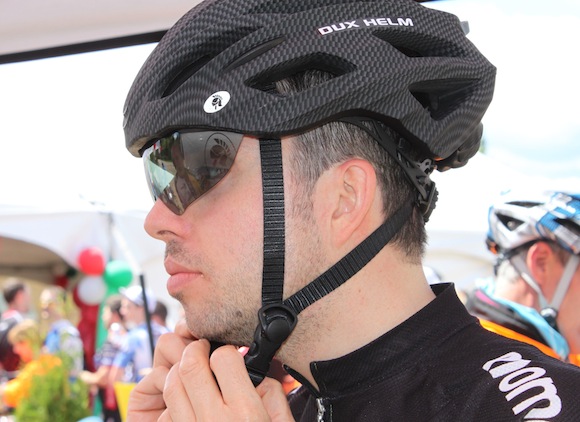 - Un participant essaie un casque Dux Helm, avec visière rétractable.